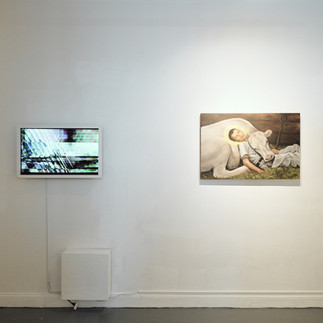 Grace Larkin’s work turns to mythology and interspecies care as antidotes to alienation. Drawing from Celtic lore, her paintings of white cows and children reference the Cow Goddess Boann and Saint Brigid—symbols of nourishment, femininity, and renewal. In a cultural climate dominated by exclusion and the bifurcation of mental, spiritual, and emotional aspects of the Self, Larkin’s imagery restores tenderness and reminds us of the sacred and healing bond between humans, animals, and the earth.